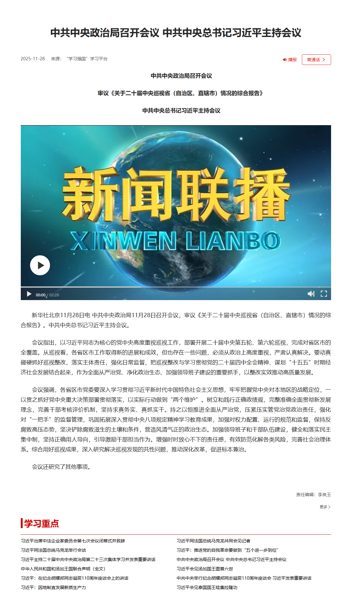 中共中央政治局召開會(huì)議 中共中央總書記習(xí)近平主持會(huì)議