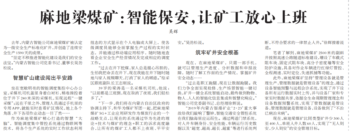 2月15日《中國煤炭報》3版:皖北煤電麻地梁煤礦智能保安,讓礦工放心上班