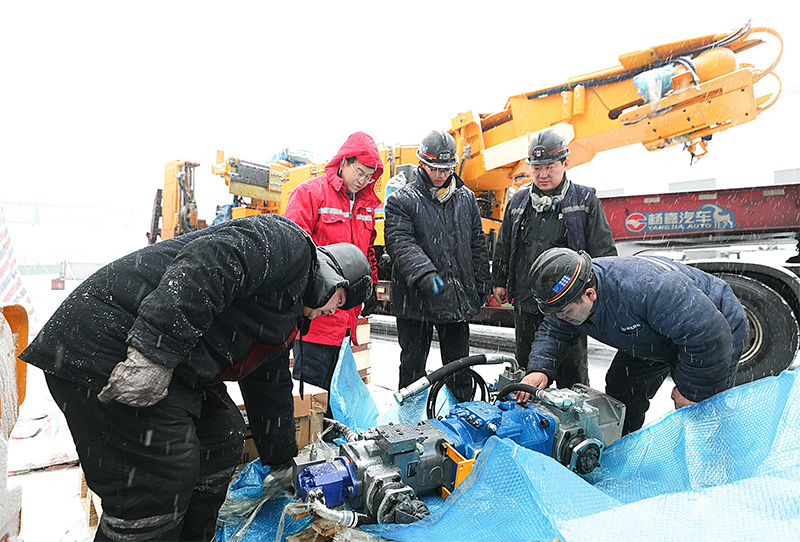 圖片說明:麻地梁煤礦掘進(jìn)區(qū)第二套掘錨成套裝備裝備頂風(fēng)冒雪進(jìn)場(chǎng),組織精干人員開展設(shè)備組裝工作。