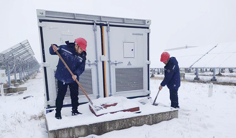 光伏電站工作人員及時(shí)清理逆變器周邊積雪,保障設(shè)備安全運(yùn)轉(zhuǎn)。