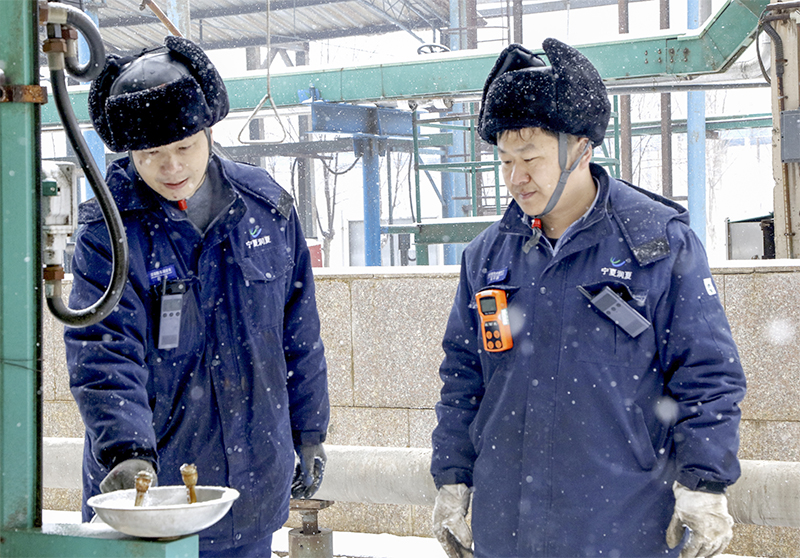 圖片說明:2月3日,寧夏中衛(wèi)市迎來了強(qiáng)降雪天氣,天寒地凍、白雪飛舞,寧夏潤(rùn)夏能源化工公司濃硝酸車間三組現(xiàn)場(chǎng)巡檢人員在裝置現(xiàn)場(chǎng)檢查重大危險(xiǎn)源硝酸罐區(qū)洗眼器出水是否正常。